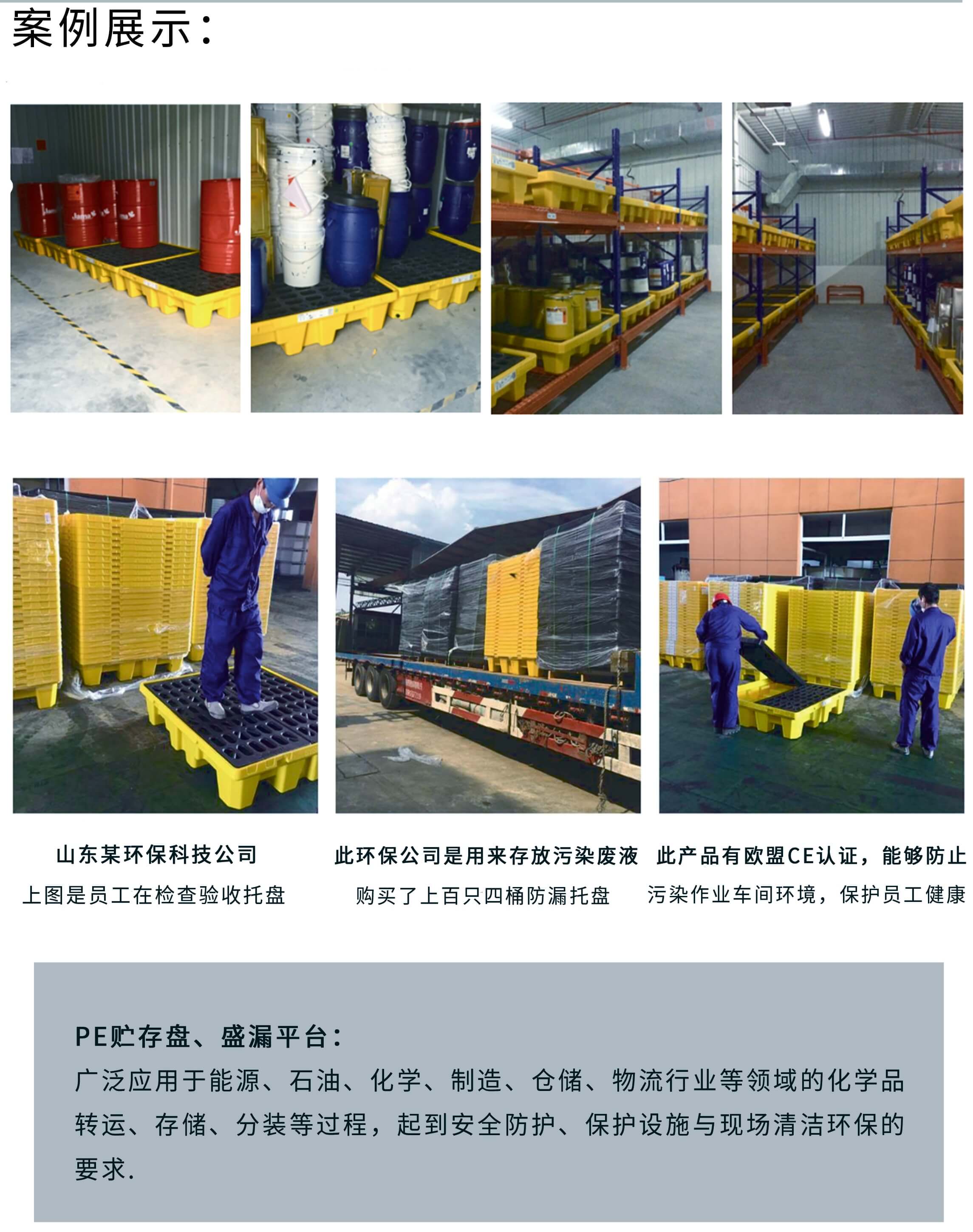 選擇使用防滲漏塑料托盤的目的是為了防止油品,化學(xué)品和危險(xiǎn)液態(tài)品在存儲(chǔ)以及分裝的過(guò)程中發(fā)生的泄漏而造成操作人員的人身傷害以及泄漏造成的環(huán)境污染。通過(guò)使用這種能盛裝泄漏出來(lái)的液體的托盤,得到一個(gè)干凈、衛(wèi)生、安全的工作環(huán)境,不僅保護(hù)操作人安全,還能有效的防止環(huán)境污染,符合環(huán)保要求。